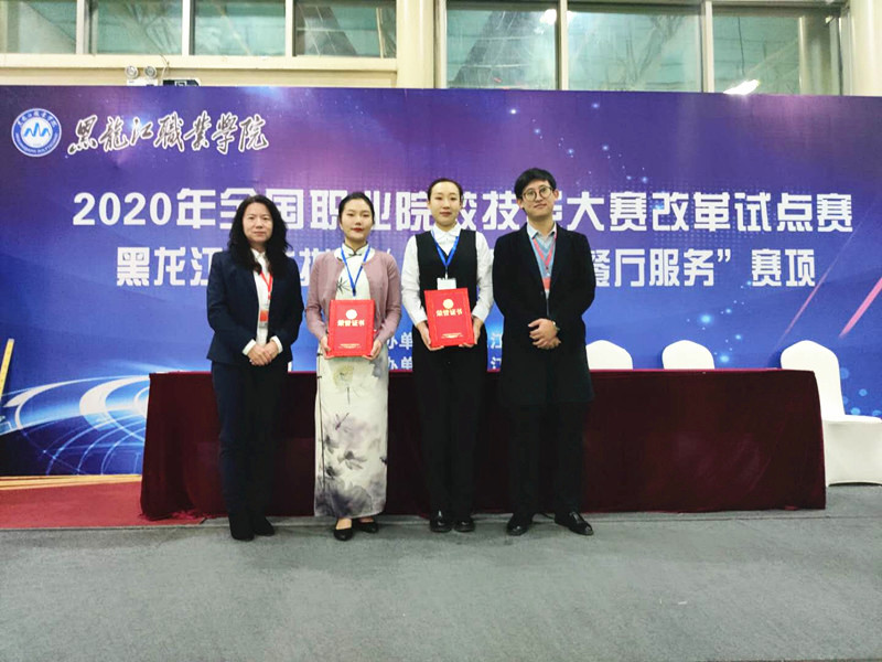 金秋时节,硕果累累。10月24日,由黑龙江省教育厅主办,永利官网承办的2020年全国职业院校技能大赛改革试点赛“餐厅服务”赛项黑龙江省选拔赛(高职组)圆满落下帷幕,来自全省六所高职院校12名参赛学生参加了比赛。永利官网参赛代表队在学院酒店管理专业教师谢芳、王迪带领下,我院参赛学生雷雨轩、冯瑞寒两位同学顽强拼搏、不负众望,在高手如云的赛场上,他们沉着冷静、敢打敢拼 ,凭借扎实的理论基础与高超的技能水平,荣获大赛一等奖,直接晋级国赛。学校校长王利文、旅游与人文艺术学院院长张玲、副院长李勇民出席大赛并为获奖选手颁奖。