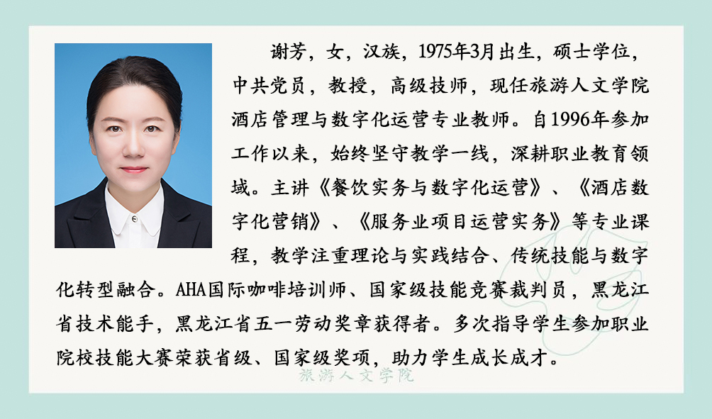酒店管理与数字化运营专业目前拥有专任教师7人、教授1人、副教授1人、讲师 4人、助教 1人;具有硕士学位 5人。专任教师中均具有高校教师资格,双师素质教师占100%,其中 7人全部拥有国家咖啡培训师证书,3人拥有国际酒店管理注册导师证书,7人拥有 1+X 职业技能等级证书培训教师资格;骨干教师中,有“五一劳动奖章”获得者1人,原五星级酒店人力资源总监1人,原皇家加勒比邮轮员工1人。同时配备兼职教师5人,均为高星级酒店中高层管理者,拥有多年酒店运营管理实战经验,涵盖前厅、餐饮、人力资源管理等核心领域,具备极强的实践教学指导与行业资源对接能力。