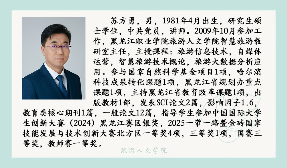智慧旅游技术应用专业目前拥有专任教师 6 人,副教授 3 人、讲师3 人;具有博士学位1人,硕士学位 5人。专任教师中均具有高校教师资格,双师素质教师占100%,其中 1 人拥有全国导游资格证书,6人拥有 1+X 职业技能等级证书培训教师资格。
