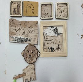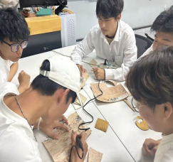 实践环节中,两位老师穿梭在学生之间,手把手现场指导大家制作桦树皮烫烙画。铅笔在桦树皮上勾勒轮廓、渐显雏形,烙铁头落下时“滋滋” 作响,金属饰品与布料的元素也被巧妙融入 —— 在师生的互动与创作中,一幅幅鲜活的桦树皮作品悄然成型,顷刻间,千年 “桦” 语跨越时光,在青春的指尖完成了生动的 “同音传译”。