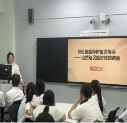 孟艳玲老师结合二十余年深耕桦树皮技艺的从业经验,将这项非遗技艺的历史脉络娓娓道来:“从鄂伦春族赖以生存的桦皮船,到承载生活智慧的桦皮盒,再到兼具艺术价值的桦皮烫烙画,每一件作品不仅是鄂伦春族适应自然、融入自然的智慧结晶,更是民族文化代代相传的鲜活载体。” 现场,她还带来多件精心收藏的桦树皮技艺作品,通过讲授工艺、拆解细节,让在场师生沉浸式感受传统手工技法与现代创新思维的深度融合,直观体验非遗文化的民俗魅力。