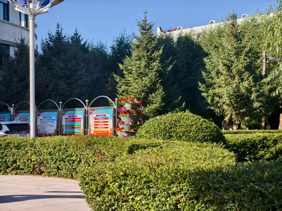 图书馆前的花坛里,格桑花、万寿菊竞相绽放,花海伴着书香,尽显校园的生机与静谧。
