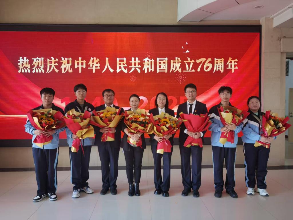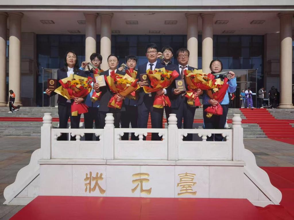 获奖者依次走上红毯,登上状元台。校长王利文,党委副书记杨东辉,副校长吴艳秋、何志鹏,纪委书记陈玉平,副校长王广文,党委委员、组织部部长石明杰分别为金奖、银奖、铜奖获奖代表颁奖,并合影留念。信息工程学院卢凤伟、庞金龙所带队伍获得金奖;张秀杰、罗洋所带队伍获得铜奖;孙伟、关丽丽所带队伍获得铜奖。